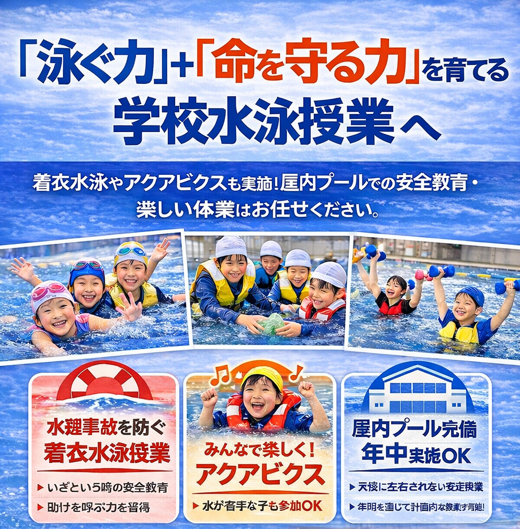 学校水泳授業 外部委託サービス ジストスポーツクラブ和歌山 「泳ぐ力」+「命を守る力」を育てる これからの学校水泳授業へ 水泳指導だけではない、 安全教育×楽しく続けられる運動を実現。 屋内プール完備で、年間を通じた […]