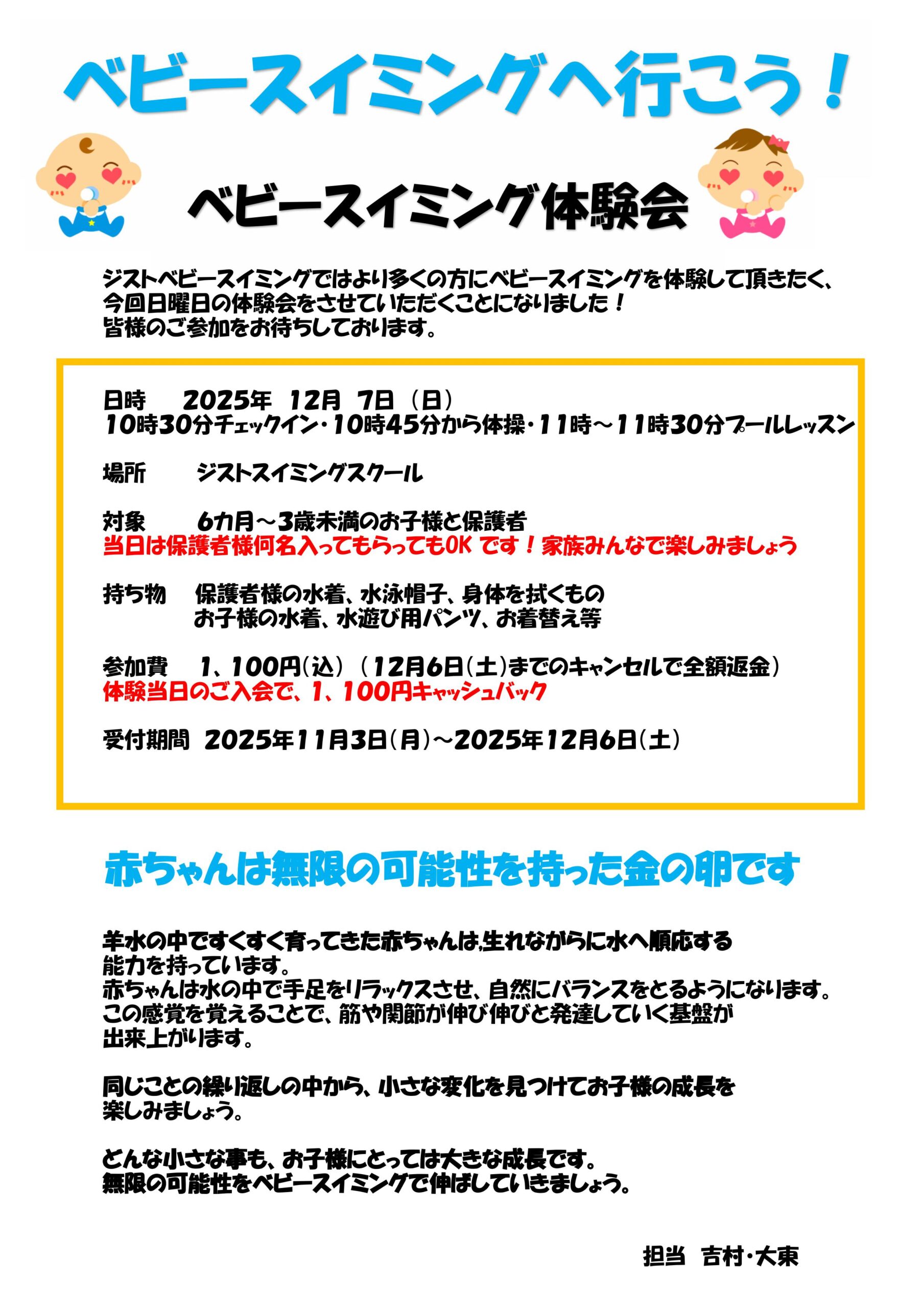 ジストのベビースイミングがこの度、日曜日に体験会を行います✨ お母さんのお腹の中にいた記憶から、赤ちゃんはお水が大好き! 赤ちゃんの秘められた可能性を引き出し・伸ばしてあげることができます。 また、同年代の […]