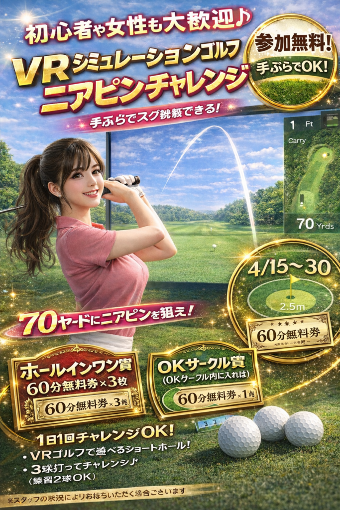 ホールインワンすれば60分無料券3枚Get🎊 4月15日~30日まで1日1回チャレンジできますよー🌈 運動終わりに、ぜひ参加してみてください❗